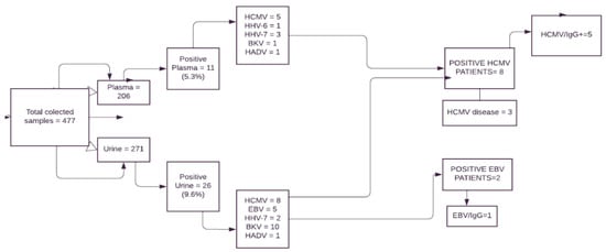- Wagner, H.J.; Wessel, M.; Jabs, W.; Smets, F.; Fischer, L.; Offner, G. Patients at risk for development of posttransplant lymphoproliferative disorder: Plasma versus peripheral blood mononuclear cells as material for quantification of Epstein-Barr viral load by using real-time quantitative polymerase chain reaction. Transplantation 2001, 72, 1012–1019. [Google Scholar] [CrossRef] [PubMed]