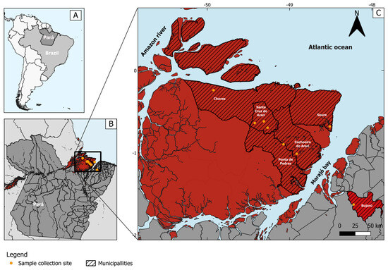 Locations of origin of herds from which samples were collected. (A) Map of Brazil (light gray), highlighting Pará state (dark gray). (B) Map showing Pará state (dark gray), highlighting Marajó island (in red). (C) Map of part of the Marajó archipelago, focusing on the main island, and highlighting municipalities of origin of the sampled animals (in red with black stripes); the yellow dots represent the location of the farms of origin of the sampled animals.