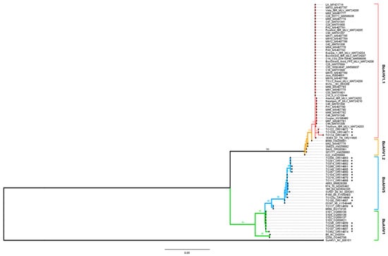 Lastly, phylogenetic analysis showed that all BuHV1 sequences, including the ones reported in this study, plus the six complete genomes deposited at GenBank to date, were more closely related to BoAHV5 than to BoAHV1. These findings are in agreement with previous studies in Argentina, Iran, and Italy, which also suggested the hypothesis of a common ancestor between BoAHV5 and BuAHV1 [31,32,61]. Remarkably, there are undisputed differences in the worldwide geographical distribution of BoAHV1 and BoAHV5: while BoAHV1 is widely spread in herds around the world, BoHV-5 seems to be concentrated in specific regions, not only in South America, where buffaloes have been introduced in the past two centuries, but also in other regions of the world where buffaloes were introduced. It is proposed here that the most recent common ancestor of BoAHV5 most likely resulted from recombination events between BuAHV1 and BoAHV1 viruses. As no BoAHV5 had been identified previously in buffaloes, common sense previous to this work suggested that recombination would most likely take place in hosts such as bovine, zebuine, or buffaloes. However, the identification of BoAHV5 in bubaline species, as reported here, raises the possibility that BoAHV5 may be generated and eventually be spilled over to bovine, zebuine, or buffaloes. The hypothesis that the BoAHV5 species may have originated following a series of recombination events between BuAHV1 and BoAHV1 is consistent with the geographical distribution of BoAHV5. As no clinically diseased buffaloes were examined here, it is not possible to associate BoAHV5 with disease in that species; thus, it remains to be determined whether this virus type could cause disease in buffaloes.