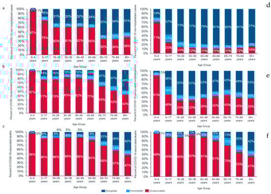 Vaccination status by age group in Brazil and Colombia for non-hospitalized, hospitalized, and deceased COVID-19 patients. Figures (a–c) correspond to Brazil, and figures (d–f) correspond to Colombia. Figures (a,d) correspond to non-hospitalized cases, (b,e) to COVID-19-associated hospitalizations, and (c,f) to COVID-19-associated deaths. Bars in red represent the proportion of unvaccinated cases among each age group. Bars in light blue correspond to the proportion of cases with an incomplete COVID-19 primary vaccination schedule and dark blue to the proportion of cases with a complete COVID-19 primary vaccination schedule among each age group. The proportion of unvaccinated cases was the highest among the deceased, followed by hospitalized cases. The proportion of cases with complete vaccination schedules was highest among older age groups for all displayed outcomes.