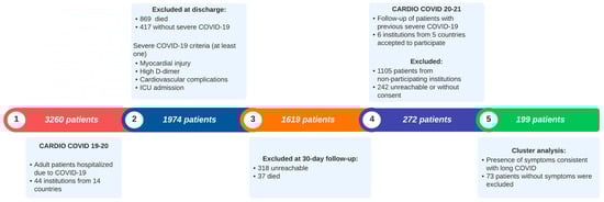 For the current registry, CARDIO COVID 20–21, six institutions from five countries (Argentina, Colombia, Ecuador, Dominican Republic, and Paraguay) accepted to participate in this 2-year follow-up (Figure 2). Of the 1619 patients initially eligible, 1105 were excluded due to various barriers faced by their institutions. These included restricted access to stored clinical files, insufficient staffing for the project, and the temporary closure of some facilities owing to the health crisis, among other factors. Of the 514 remaining patients, 242 were excluded as they could not be reached or declined participation. 272 accepted to participate. For this subanalysis, 73 patients were excluded due to the absence of symptoms consistent with long COVID, resulting in 199 patients for the final analysis (Figure 1 and Figure 2).