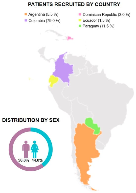 Patient recruitment by country and distribution by sex.