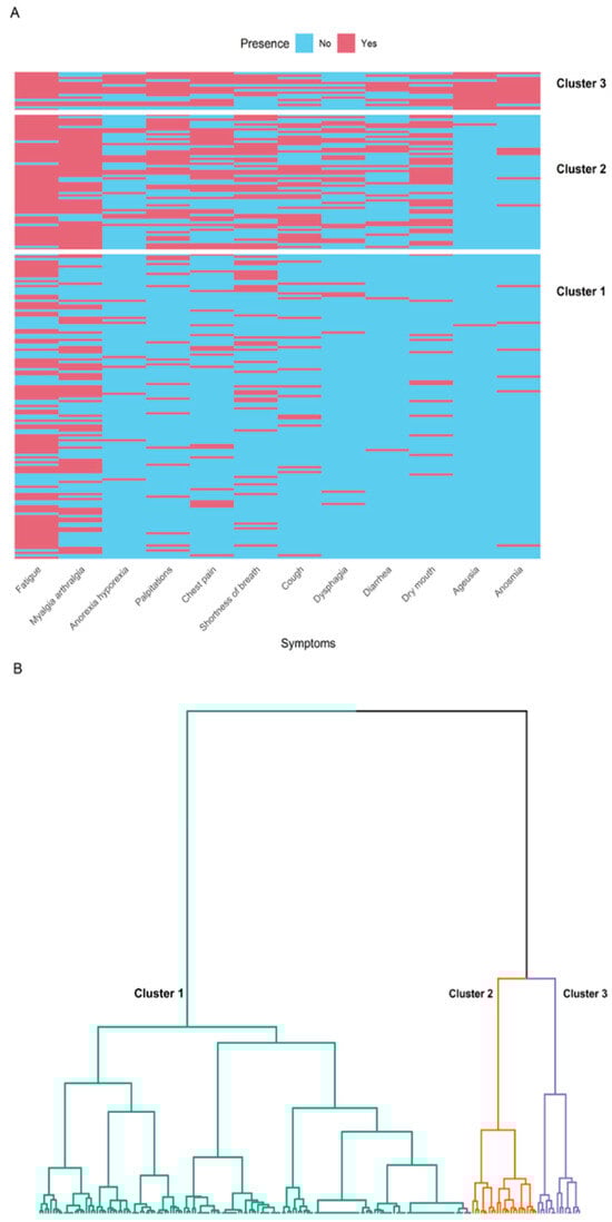 Dendrogram and heatmap of clusters of symptoms. (A): Heatmap showing the presence or absence of various symptoms in patients with long COVID, grouped into three distinct clusters (1, 2, and 3). Each row represents an individual patient, and each column represents a specific symptom. The presence of a symptom is indicated in red (Yes), while the absence is indicated in blue (No). (B): Dendrogram illustrating the hierarchical clustering of patients with long COVID based on their symptom profiles. The dendrogram shows three clusters: Cluster 1, Cluster 2, and Cluster 3.