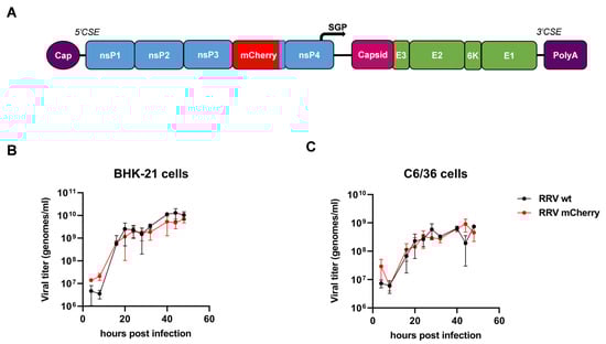 To further ensure that the in vitro replication of RRV-mCherry was not altered, the growth kinetics were compared to wild-type RRV (RRV wt) generated from the original RRV cDNA clone pRR64 [23]. The growth characteristics were compared in BHK-21 cells and the Ae. albopictus cell line C6/36. The cells were infected with RRV-mCherry or RRV wt at an MOI of 1 and the cell supernatants were collected at several time points after infection. The amount of virus was determined by RT-qPCR and normalized to a virus stock of known titer; values are indicated as genomes per ml. No difference in the growth kinetics were observed between RRV-mCherry and RRV wt, neither in mammalian cells nor in insect cells (Figure 1B,C). However, about 1 log more virus was produced in BHK-21 cells than in C6/36 cells.