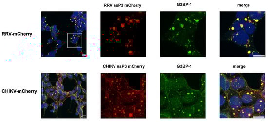 Assembly of nsP3-containing complexes. HEK 293T cells were infected with RRV- and CHIKV-mCherry at an MOI of 1 and fixed after 18 h. The cell nuclei were stained with DAPI (blue) and G3BP-1 with a specific antibody (green); nsP3 is visible due to the red mCherry fluorescence. Representative pictures of two independent experiments are shown. The images were taken at 93× magnification and the scale bars in the merge images correspond to 10 µm.