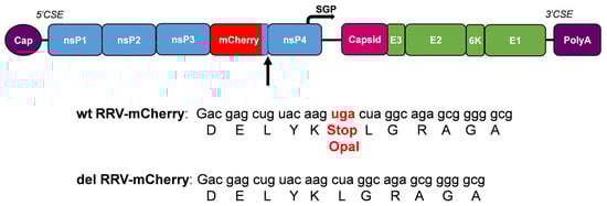 To evaluate the effect of the opal stop codon, a recombinant RRV genome was similarly constructed by using a synthetic DNA fragment containing the mCherry gene flanked by nsP3 and nsP4 sequences without the opal stop codon after the nsP3 gene (del RRV-mCherry) (Figure 3).