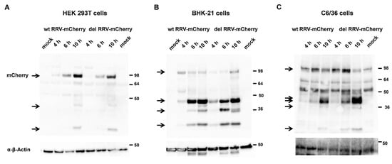 The del RRV-mCherry variant should synthesize a nsP1-4 protein with stoichiometric amounts of nsP3 and nsP4. Wt RRV-mCherry and del RRV-mCherry were produced from in vitro-transcribed single-stranded RNA by transfection into BHK-21 cells. The experiments were performed with virus after three passages on BHK-21 cells. The titer was determined by plaque assay and titration on Vero E6 cells and the virus genomes were analyzed by RT-PCR and sequencing. The deletion of the stop codon and the wt sequences were preserved correspondingly indicating that del RRV-mCherry was stable during virus amplification. We first aimed to compare the infection kinetics of the two RRV-mCherry viruses in the cell lines HEK 293T, BHK-21 and C6/36 insect cells. The cells were infected at a MOI of 1, and first analyzed by Western blot analysis of the nsP3-mCherry fusion protein (Figure 4). Although the deletion of the stop codon should generate an nsp1-4 fusion protein, there was no difference detectable in the molecular weight of the nsP3-mCherry protein from wt RRV or del RRV-mCherry, even at the early time point of 2 h after infection (hpi). At later time points nsP3-mCherry started to become degraded and lower migrating bands appeared (Figure 4A). Compared to HEK 293T cells, BHK-21 cells were much faster infected and after 4 hpi full length nsP3-mCherry was hardly detectable (Figure 4B). In C6/36 insect cells, these degradation products appeared at 10 hpi (Figure 4C). However, there were no substantial difference in the nsP3-mCherry amounts between wt RRV- or del RRV-mCherry-infected cells.
