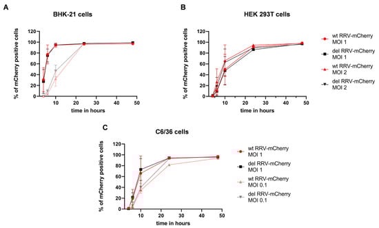 Virus replication kinetics in cell lines. (A) BHK-21, (B) HEK 293T, or (C) C6/36 cells were infected at the indicated MOIs. The percentage of mCherry-positive cells was determined by flow cytometry at 4, 6, 10, 24, and 48 h. The mean values ± standard deviations from at least three independent experiments are indicated. For statistical analysis, an unpaired t-test was performed and showed no significant differences between wt RRV- and del RRV-mCherry infections.