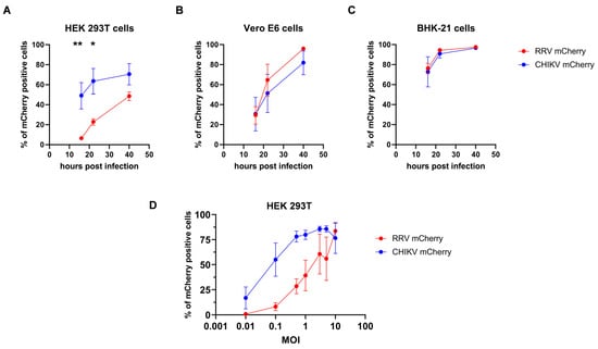 Comparison of RRV-mCherry and CHIKV-mCherry replication kinetics. The replication kinetics of RRV-mCherry and CHIKV-mCherry were determined in (A) HEK 293T, (B) Vero E6, and (C) BHK-21 cells. Cells were infected at an MOI of 0.1 and the percentage of infected cells was determined by flow cytometric analysis. The mean values ± standard deviations of five repeats are plotted. RRV-mCherry is depicted in red and CHIKV-mCherry in blue. (D) HEK 293T cells were infected at the indicated MOIs and analyzed 16 h after infection. For statistical analysis, a two-way ANOVA followed by Sidak’s multiple comparison was performed (* p < 0.05; ** p < 0.01).