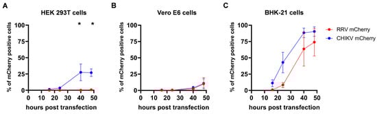 Virus replication after transfection of genomic RNA. (A) HEK 293T, (B) Vero E6, and (C) BHK-21 cells were transfected with 1 μg genomic RRV- or CHIKV-mCherry RNA and the percentage of mCherry-positive cells was determined by flow cytometry at the indicated time points. The mean values ± standard deviations from two independent experiments are indicated. For statistical analysis, a two-way ANOVA followed by Sidak’s multiple comparison was performed (* p < 0.05).