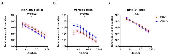 To further support that the difference between RRV and CHIKV infection of HEK 293T are caused by impaired cell entry, transduction by pseudotyped lentiviral vector particles encoding the luciferase gene was evaluated. As receptor binding and membrane fusion are carried out by the alphaviral glycoproteins, lentiviral vectors carrying either the RRV or the CHIKV envelope proteins thereby obtain the host range of the respective virus. Vectors containing the RRV or CHIKV glycoproteins E3–E1 and a luciferase reporter gene were used in two-fold dilutions to transduce the target cells [26]. Transduction, and thus cell entry, was quantified as luciferase units. HEK 293T cells showed a significantly higher level of transduction by RRV- than by CHIKV-pseudotyped vectors, indicating that RRV cell entry is efficient in HEK 293T cells and does not cause the impaired replication (Figure 8A). In contrast, Vero E6 cells showed slightly higher transduction by CHIKV-pseudotyped vectors (Figure 8B). Both vectors showed a 10-fold enhanced transduction of BHK-21 (Figure 8C), which correlates with the fast replication of the viruses in BHK-21 cells (Figure 6C).