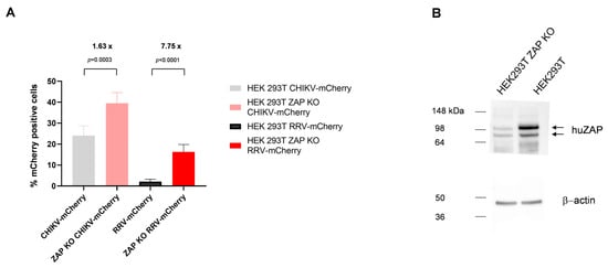 Virus replication in huZAP knock-out cells. HEK 293T ZAP KO cells were infected either with CHIKV- or RRV-mCherry at an MOI of 0.1. (A) The percentage of mCherry-positive cells in HEK 293T ZAP KO or HEK293T cells was determined at 10 hpi. The ratio of mCherry-positive cells in HEK 293T ZAP KO compared to HEK293T is given and the difference was highly significant as indicated by the p values. For statistical analysis, an unpaired t-test was performed. (B) HuZAP and actin expression was analyzed by Western blot analysis from cell lysates of HEK 293T ZAP KO or HEK293T cells using an huZAP- and β-actin-specific antibody. Actin was detected as loading control.