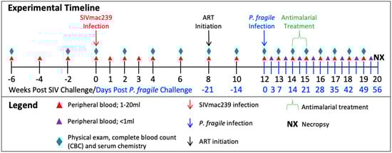 Co-infection of SIV+ RMs with P. fragile has been conducted previously [56,57]. However, our pilot study represents the first assessment of P. fragile co-infection in the context of ART-treated SIV infection. Here, we observed that ART-treated SIV+ RMs exhibited peripheral parasitemia within two weeks of P. fragile co-infection, which coincided with mild–severe anemia. These findings are in line with previous work that demonstrated that RMs inoculated with P. fragile via a similar route, but with differences in the dose and treatment regimen used, also exhibited peripheral parasitemia and anemia within two weeks of inoculation [56]. Notably, ART-treated SIV/P. fragile-co-infected RMs in our pilot study experienced parasitemia and anemia greater than that observed during P. fragile infection only RMs in the previously published study [56], possibly suggesting that P. fragile infection in ART-treated SIV+ RMs results in the exacerbation of clinical hallmarks of malaria infection, as compared to P. fragile infected only RMs. However, given the differences in the inoculation doses and treatment regimens used in our pilot study and in this previously published work, we are unable to definitively make this conclusion with our current data.