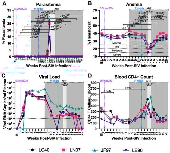 Uncontrolled VLs and decreased CD4+ T-cell counts within a few weeks following infection are hallmarks of pathogenic HIV/SIV [77,78,79,80]. Treatment with ART has been shown to suppress viral replication and restore CD4+ T-cell counts in SIV+ RMs, even at end stage of disease [63,81]. Here, we observed that peak viremia in RMs inoculated with SIVmac239 occurred by week 3 p.i. (median = 1.160 × 107 copies/milliliter; Figure 2C). Lower VLs were observed following ART, with two out of four RMs (LC40 and LE96) exhibiting undetectable VLs by week 12 p.i. (Figure 2C). Following P. fragile inoculation, all RMs exhibited VLs above the limit of detection from weeks 13 to 17 p.i. (Figure 2C). A longitudinal assessment by JoinPoint regression demonstrated that following P. fragile co-infection, the VLs of all four RMs remained unchanged, indicating viral persistence (Supplemental Figure S3). Between weeks 18 and 20 p.i., one RM (LE96) had transiently detectable VLs, two RMs had undetectable VLs by weeks 19 (LN07) and 20 (LC40) p.i., with the final RM (JF97) remaining incompletely suppressed. When comparing all timepoints to each other, we observed that absolute CD4+ T-cell counts were significantly lower at week 3 p.i. compared to BL (p = 0.0414; Figure 2D). CD4+ T-cell counts remained low until ART initiation at week 8 p.i. (Figure 2D). Following P. fragile inoculation, CD4+ T-cell counts were significantly increased at week 13 p.i. compared to week 3 p.i. (p = 0.0397; Figure 2D). By week 17 p.i. following antimalarial treatment, CD4+ T-cell counts returned to pre-ART levels (Figure 2D). In follow-up analyses comparing all timepoints to BL only, weeks 3 and 8 p.i., timepoints that are representative of early acute and late acute/early chronic SIV infection, were significantly elevated as compared to BL (p = 0.019 and 0.0362, respectively; Supplemental Table S4). These data indicate that clinical signs of SIV infection, including VLs above the limit of detection and fluctuations in CD4+ T cell counts, were apparent following P. fragile co-infection of ART-treated SIV+ RMs.