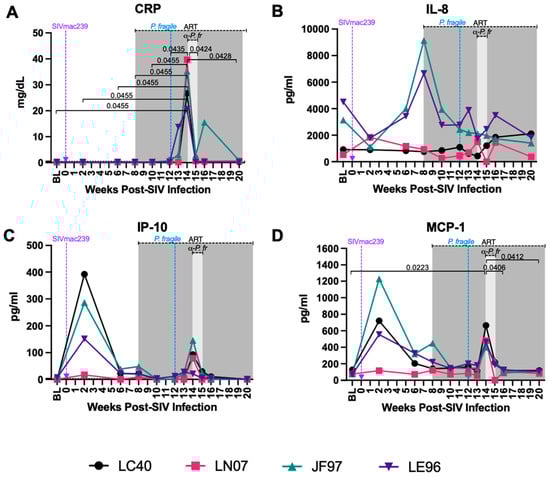 Variable levels of inflammatory markers throughout P. fragile co-infection of ART-treated SIVmac239-infected rhesus macaques. CRP, cytokine, and chemokine levels were measured throughout P. fragile co-infection of ART-treated SIVmac239-infected rhesus macaques (RMs) (n = 4). (A) CRP levels were measured in serum by a Beckman au480. (B–D) IL-8 (B), IP-10 (C), and MCP-1 (D) levels were measured in plasma by LegendPlex. In all panels, each RM is represented by a different symbol and color. Baseline (BL) is the average of data collected at weeks 6, 2, and 0 post-SIV infection (p.i.). Inoculation with SIVmac239 at week 0 p.i. is indicated by a purple dashed arrow. Inoculation with P. fragile at week 12 p.i. is indicated by a blue dashed arrow. Antiretroviral therapy (ART) was initiated at week 8 p.i., indicated by the dark-grey bar. Antimalarial treatment occurred throughout week 14 p.i., indicated by the light-grey bar. Statistical significance between all timepoints was calculated using a mixed-effects analysis with the Geisser–Greenhouse correction and a Tukey’s multiple-comparison test, with individual variances computed for each comparison. Significant multiplicity-adjusted p values are shown above horizontal black bars.