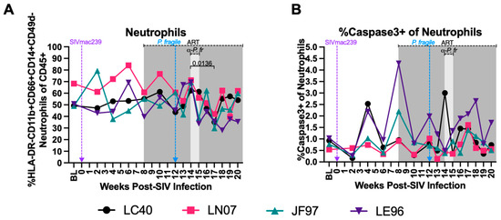 Neutrophil-associated inflammation has been shown to contribute to increased pathogenesis in separate HIV and Plasmodium infection [50,89,90,91,92]. Therefore, we next characterized peripheral neutrophil dynamics and apoptosis via flow cytometry. Neutrophils were identified as viable, CD45+ HLA-DR- CD11b+ CD66abce+ CD14+ CD49d- cells, as previously described (Supplemental Figure S1) [92,93,94,95,96,97]. As previously demonstrated [98], total peripheral neutrophil frequencies were consistent throughout acute SIV infection and ART treatment (Figure 4A). Neutrophil frequencies were significantly decreased following antimalarial treatment as compared to the start of antimalarial treatment (week 17 vs. 14 p.i., p = 0.0136), followed by stable neutrophil frequencies until study endpoint in week 20 p.i. (Figure 4A). When all timepoints were compared to BL only, there was a significant difference in the neutrophil frequencies at week 17 p.i. as compared to BL (p = 0.0295; Supplemental Table S6). The percentages of apoptotic peripheral neutrophils (caspase3+) fluctuated across all the timepoints (Figure 4B). These data indicate that neutrophil frequencies decrease following clearance of P. fragile in ART-treated SIV+ RMs, while neutrophil apoptosis was unchanged throughout ART-treated SIV only infection and P. fragile co-infection.