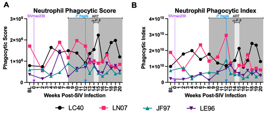 Impaired phagocytosis has been observed in separate HIV and Plasmodium infection [37,38,45,46,47]. Here, we calculated peripheral blood neutrophil phagocytic score (capability) and index (proficiency) throughout ART-treated SIV/P. fragile co-infection. Although inter-animal variations in neutrophil phagocytic score (Figure 5A) and index (Figure 5B) were observed, no statistically significant changes in either phagocytosis parameter were detected over time when comparing all timepoints to each other and when comparing all post-infection timepoints to BL only (Supplemental Table S7).