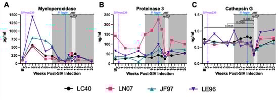 Plasma levels of MPO, PR3, and CATG, three extracellular neutrophil degranulation secreted components [99,100], were quantified throughout ART-treated SIV/P. fragile co-infection. Consistent with prior work [101], plasma MPO levels were elevated in all four RMs at week 2 p.i., but no statistically significant differences were observed throughout SIV infection, ART treatment, or P. fragile co-infection (Figure 6A). Likewise, plasma levels of PR3 were stable throughout acute SIV infection, ART treatment, and P. fragile co-infection (Figure 6B). Finally, a statistically significant decrease in CATG was observed at week 14 p.i., compared to BL and weeks 6 and 10 p.i. (p = 0.032, 0.0038, and 0.0331, respectively), followed by a return to BL levels following antimalarial treatment (Figure 6C). When all timepoints were compared to BL alone, plasma levels of CATG were significantly decreased at week 14 p.i. as compared to BL (p = 0.0161, Supplemental Table S8). These data indicate that P. fragile co-infection of ART-treated SIV+ RMs resulted in lowered plasma levels of CATG.