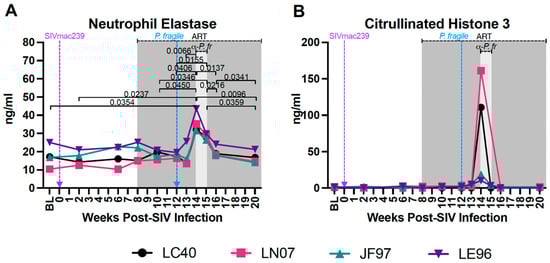 Excessive NET formation contributes to inflammation in separate HIV and Plasmodium infection [33,48,52,53]. We assessed plasma levels of NE and CitH3, biomarkers of NET formation [102], throughout ART-treated SIV/P. fragile co-infection. Plasma levels of NE were significantly increased at week 14 p.i. compared to BL and weeks 2, 10, 12, and 13 p.i. (p = 0.0354, 0.0237, 0.0450, 0.0406, and 0.0066, respectively; Figure 7A) but were significantly reduced at weeks 16 and 20 p.i. as compared to week 14 p.i. (p = 0.0137 and 0.0096, respectively) and week 15 p.i. (p = 0.0359 and 0.0216, respectively; Figure 7A). Plasma NE was significantly lower at week 20 p.i. compared to week 16 p.i. (p = 0.0341; Figure 7A). In follow-up analyses comparing all timepoints to BL only, plasma NE levels were significantly elevated at week 14 p.i. as compared to BL (p = 0.0179; Supplemental Table S9), highlighting the association between co-infection and elevated NE expression. Plasma levels of CitH3 were elevated in all four RMs at week 14 p.i., but no statistically significant differences were observed throughout SIV infection, ART treatment, or P. fragile infection (Figure 7B). In sum, these findings suggest that P. fragile infection is specifically linked with increased levels of NE, a marker of NET formation.