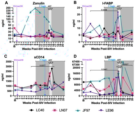 The loss of the GI epithelial barrier integrity leads to microbial translocation in both HIV and Plasmodium infection [39,43,44,103]. Here, we examined plasma levels of zonulin, a protein that modulates tight junctions [104]; I-FABP, a circulating biomarker of intestinal injury [105,106]; sCD14, which is released from monocytes upon lipopolysaccharide (LPS) stimulation; and LBP, which assists in LPS recognition by interacting with LPS receptors [107]. Inter-animal variation in plasma zonulin levels was observed throughout the study (Figure 8A). Plasma I-FABP was significantly increased at week 14 p.i. compared to week 2 p.i. (p = 0.0436; Figure 8B), sCD14 was significantly greater at week 16 p.i. compared to week 6 p.i. (p = 0.0377; Figure 8C), and LBP was significantly increased at week 14 p.i. compared to weeks 2, 15 and 20 p.i. (p = 0.0441, 0.0305, and 0.0027, respectively; Figure 8D). In follow-up analyses comparing all timepoints to BL only, plasma LBP at week 14 p.i. was significantly increased as compared to BL (p = 0.0367; Supplemental Table S10). These findings indicate that P. fragile co-infection may exacerbate GI epithelial barrier disruption, resulting in microbial translocation, in ART-treated SIV+ RMs.