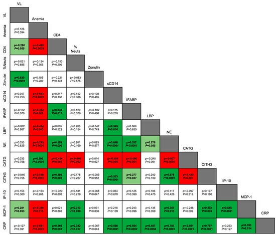 Multivariate ANOVA (MANOVA) reveals significant correlations between clinical markers of SIV and malaria infection, as well as neutrophil frequency and function and peripheral markers of GI dysfunction. Pearson’s partial correlation coefficients were generated using a MANOVA for 14 different parameters (VL; anemia; absolute CD4+ count; peripheral neutrophils; plasma zonulin; sCD4; I-FABP; LBP; NE; cathepsin G; CitH3; IP-10; MCP-1; and CRP). The correlation coefficients were adjusted against animal number. Boxes highlighted in light green represent positive correlations trending towards significance (0.05 < p < 0.07), and boxes highlighted in dark green or red represent statistically significant positive and negative correlations, respectively (p < 0.05).