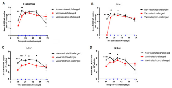 Viral loads of the rHVT-IBD vaccine were detected in chicken organs of the challenged and vaccinated/challenged groups collected at six time points (14, 21, 28, 35, 49, and 67 d.p.v.). DNA was extracted, and a real-time PCR was performed to detect the viral load of Md5. The following was ascertained: (A), load changes in Md5 in feather tips; (B), load changes in Md5 in the skin; (C), load changes in Md5 in the liver; (D), load changes in Md5 in the spleen; (E), load changes in Md5 in the thymus; (F), load changes in Md5 in bursa; and (G), load changes in Md5 in PBL. The black line represents the Md5 load changes in the challenged group, and the red line represents the load changes in the vaccinated/challenged group. Each dot corresponds to a sampling time point, n = 7, and the viral load of Md5 was normalized per million cells. The results of the Md5 viral load between the challenged and the vaccinated/challenged groups were statistically analyzed using an unpaired t-test, and all data were reported as the mean ± S.E.M when a p-value < 0.05 was considered significant. * p < 0.05, ** p < 0.01, *** p < 0.001, **** p < 0.0001.