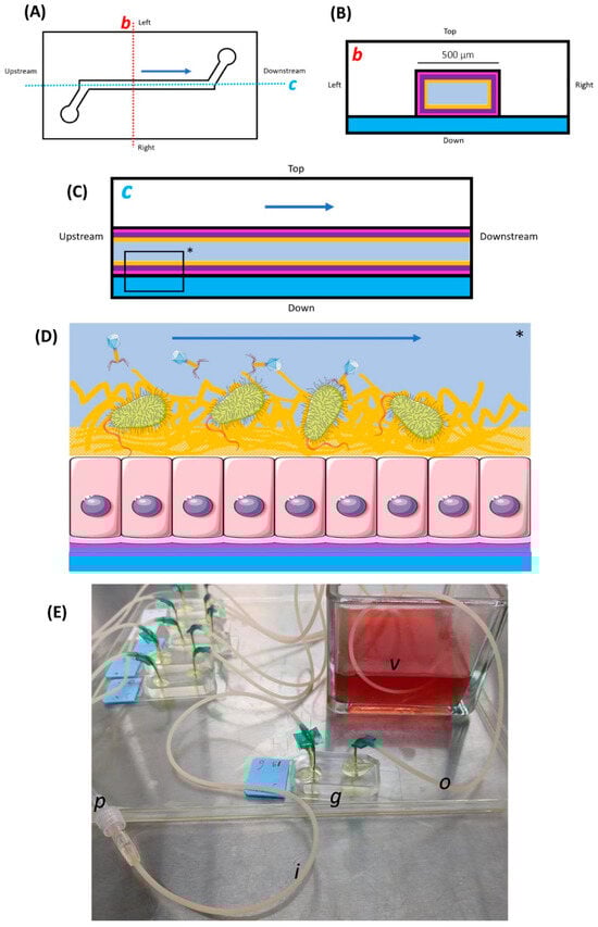 Schematic and photographic views of the Gut-On-A-Chip (GOAC). (A) A schematic upper view of the GOAC pattern. The lower left and upper right circles represent the inlet and outlet pores, respectively, between which the GOAC channel is carved. The dark blue arrow represents the direction of the microfluidic flow of the culture medium in the GOAC. The dotted line axes b (red) and c (blue) are used for further schematic representations. (B) The transversal section in the GOAC is shown along axis b. The floor of the GOAC is a glass slide (blue) on which a carved polydimethylsiloxane (PDMS) chip (white) is sealed, between which the GOAC channel itself is delimitated. The several concentric layers of the GOAC’s “gut wall” are represented, from outer to inner: the extra-cellular matrix (pink), epithelium (violet), parietal mucus layer (yellow), and the central flow of the culture medium (grey). (C) The longitudinal section in the GOAC is shown along axis c. The elements are similar to those of the transversal section. (D) A schematic zoom in a segment (*) of the longitudinal section. In this work, the GOAC model is designed to recapitulate the scenario of phage therapy targeting bacteria in the digestive micro-environment, which includes a parietal mucus layer. (E) A picture of a GOAC. The GOAC itself (g) is connected to the inlet (i) and outlet (o) winged catheters, respectively, introducing and evacuating all reagents to and from the GOAC. The winged catheters’ needles are manually curved to be punched in inlet and outlet pores, forming a 90° angle with the PDMS chip surface. At the point where the needles are punched into the PDMS chip, epoxy glue is applied to ensure impermeability. The culture medium is infused by a microfluidic pump connected to the inlet catheter by a connecting catheter (p). Egressing medium coming out of the GOAC through the outlet catheter is evacuated in a glass collecting vessel (v) filled with a base level of 70% v/v isopropyl alcohol (IPA).