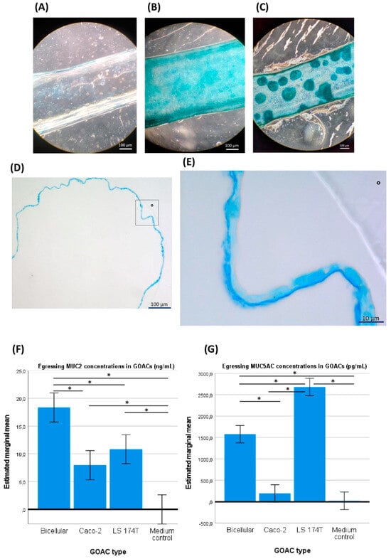 GOAC visualization and mucus production. (A) An upper view in light microscopy of a negative control GOAC (seeded with the usual cell load but without prior extra-cellular matrix coating) shows little to no staining after in-GOAC Alcian blue staining protocol compared to a fully confluent 100% Caco-2 cellularized GOAC (B) and a 50%/50% Caco-2–LS 174T bicellular GOAC (C). A general view (D) and close-up view (from the rectangle in D, ° as graphical marker) (E) of a histological section performed in a cellularized segment of a 100% Caco-2 GOAC’s inlet catheter add further validation of the model’s inner tissue architecture. A continuous mono-layer epithelium is seen lining the inner plastic wall (°) of the inlet catheter, seemingly producing a continuous ~2 µm thick layer of an intensely Alcian blue-stained compound, likely mucus. Quantitative ELISA tests targeting mucin MUC2 (F) reveals significantly superior MUC2 production in bicellular GOACs than in both the medium negative control and any mono-cellular GOACs. An identical assay targeting mucin MUC5AC (G) reveals significantly superior MUC5AC production in the bicellular GOACs than in the medium negative control and in the Caco-2 mono-cellular GOACs but significantly inferior MUC5AC production than in the LS 174T mono-cellular GOACs. *: statistically significant difference (p < 0.05) in univariate ANOVA (see Section 2).