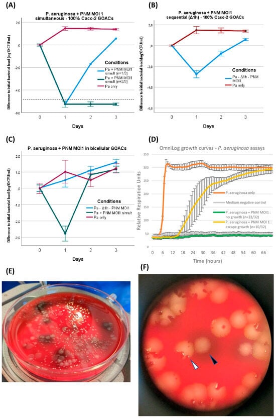 P. aeruginosa CN573 versus phage PNM assays. P. aeruginosa titer evolution when introduced in GOACs with phage PNM (MOI = 1) in various conditions: (A) simultaneous introduction of P. aeruginosa and PNM in 100% Caco-2 GOACs (dotted line represents detection threshold in spread plating, <102 CFU/mL) (n = 3), (B) sequential introduction of P. aeruginosa first with subsequent introduction of phage PNM after 1 h static incubation delay in 100% Caco-2 GOACs (n = 3), (C) replication of these two conditions in bicellular GOACs (n = 3 each). (D) P. aeruginosa and PNM (MOI = 1) control growth curves in static in vitro conditions using OmniLog automated incubator, with bacterial respiration units being measured as proxy for bacterial growth (initial bacterial load of 105 CFU/well; n = 32 wells for P. aeruginosa + PNM, 16 wells for P. aeruginosa only, and 16 wells for negative control; error bars represent +/−1 standard deviation of mean). (E) Spread plating on 5% sheep blood Columbia agar plates highlights intense phenotypic diversification in P. aeruginosa CN573 after co-evolution with phage PNM in GOACs, displaying at least four distinct colony morphologies out of single GOAC after 48 h. (F) Close-up view of one of these plates reveals co-existence of wild-type colonies (white arrow), systematically including phage-induced lysis plaques, along with modified colonies, for example, exhibiting dark pigmented halo (black arrow), systematically devoid of any lysis plaques. [Pa: P. aeruginosa; GOAC: Gut-On-A-Chip; MOI: Multiplicity of Infection].