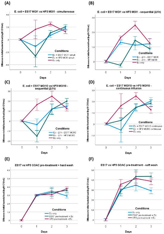 We decided to replicate this condition of sequential administration using a tenfold higher phage load (MOI 10 instead of 1 for all previous assays), keeping all other parameters unchanged. This led to a moderately more favorable phage effect, seemingly reverting the bacteria-favoring effect of sequential administration instead of simultaneous administration. The titer curves are indeed largely similar in these conditions to those of the GOACs tested with simultaneous bacteria–phage introduction. Yet even this higher MOI failed to elicit a major reduction in bacterial titers below the detectability threshold at any timepoint. In addition, ES17 again seemed to perform more poorly than HP3 in these conditions, failing to reduce the bacterial titer levels below the initially instilled bacterial titer levels at any timepoint (Figure 6B).