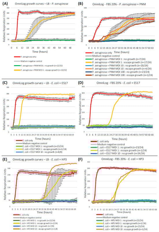OmniLog data were analyzed using OmniLog data Analysis Software (v1.7). OmniLog growth curves based on these results represent bacterial proliferation in various conditions and are presented through relative units of cellular respiration over time. Error bars in these graphs represent +/−1 standard deviation of the mean. Positive and negative control conditions were replicated in 16 wells in each assay. In LB-only assays, P. aeruginosa with PNM at MOI = 1 was replicated in 32 wells. E. coli assays with either phage ES17 or HP3 were replicated in 24 wells at MOI = 1 and in 8 wells at MOI = 10. In control assays using serum-supplemented LB, all bacteria–MOI combinations were replicated in 24 wells. Comparison of bacterial “escape” growth rate between OmniLog assays and GOAC assays was performed using Fischer’s exact test.