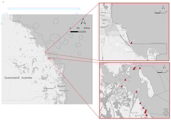 Map of Queensland, Australia, with GPS plotting of the 16 green sea turtles at Port Curtis and Yeppoo that underwent both a gross post mortem examination and histopathological assessment. Letters A–P are indicators for locations.
