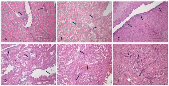Examples of endo- and myocarditis in six of the investigated GSTs (A–F). Arrows point to more intense infiltration of lymphocytes and macrophages sub-endothelially in the endocardium and interstitially in the myocardium. White star in (F): area of cardiomyocyte degeneration. Scale bars in (A–E): 600 µm; scale bar in (F): 300 µm.