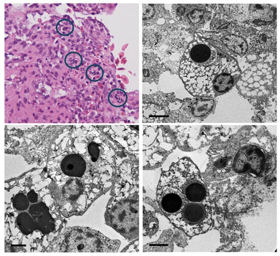 Light microscopic (top left) and TEM appearance of cytoplasmic inclusions in leukocytes in the subendothelial stroma of a green sea turtle with endo- and myocarditis. Top left panel: examples of inclusion-containing cells in the endocardium are circled. Top right panel: scale bar = 4 µm. Bottom panels: scale bars = 2 µm.