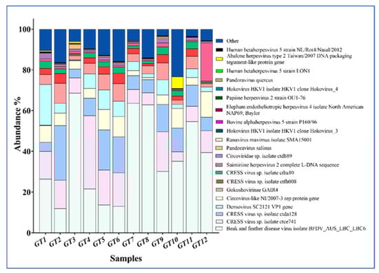 Principal component analysis (PCA) showed that the virome profiles of GT3 and GT12 were very similar, while the virome profiles of G1 and GT10 differed substantially from all other samples (Figure 5). The remainder of the animals had relatively similar virome profiles.