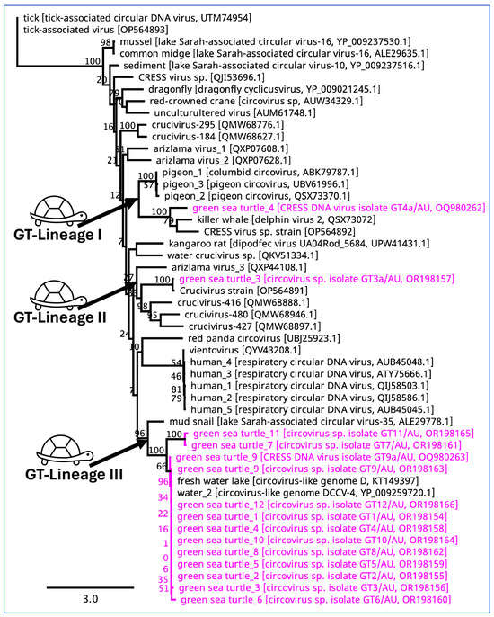 Phylogenetic tree of circoviruses with placement of the circoviruses detected in the green sea turtles of this study. The numbers on the left show bootstrap values as percentages, and the labels at branch tips refer to the original sampling host, followed by the circovirus name and GenBank accession numbers in parentheses. The sequences that correspond to the circoviruses detected in this study are shown in pink.