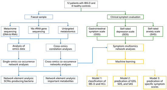 A flowchart of this study is illustrated in Figure 1. We recruited patients with IBS-D (n = 12) and healthy volunteers (n = 8) from the First Affiliated Hospital of Sun Yat-sen University. All the participants provided written informed consent. This study was approved by the Ethics Committee of the First Affiliated Hospital of Sun Yat-sen University (no. 2023482).