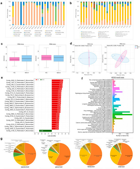 DNA viruses: The abundance of 25 contigs differed significantly between the two groups (Figure 2e, LEfSe analysis, LDA score > 2, p < 0.05). Of those with increased abundance in HCs, seven were classified as Siphoviridae family (four as Brussowvirus genus), five were classified as Podoviridae family (one as Salasvirus genus), eight were classified as Microviridae family, one was classified as Myoviridae family, and the remaining three were unclassified at the family level (Figure 2e). Only one contig increased in IBS-D, which was classified as Microviridae family. Unclassified viruses were significantly increased in the IBS-D group when the taxonomic classification was moved to the species level (LEfSe analysis, p = 0.017) and order level (LEfSe analysis, p = 0.037), indicating that some viruses that have not been identified may also differ between the two groups. We also used the Mann–Whitney U test to identify viruses with significant differences between the two groups. At the genus level, Cequinquevirus, Slopekvirus, Toutatisvirus, and Cepunavirus were significantly depleted in the IBS-D group. However, Pbunavirus and Oshimavirus were significantly enriched in the patients with IBS-D (Supplementary Table S2). At the species level, Klebsiella virus Matisse, from the Slopekvirus genus, was significantly depleted in the IBS-D group (Supplementary Table S2).