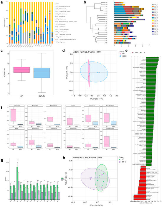 Gut bacteria characteristics of IBS-D and HC. (a) Barplot showing the abundance of gut bacteria in IBS-D and HC at the OTU level. (b) Phylogenetic tree of different samples at the OTU level. (c) Boxplots of alpha diversity (Shannon) estimates for IBS and HC (p = 0.53). For the boxplots, the boxes span from the first quartile to the third quartile, while the central line represents the median. (d) The bacterial community structure of IBS-D was significantly alternated compared to HC (Adonis test, p = 0.001). (e) LEfSe analysis identified 106 differentially abundant taxa between IBS-D and HC. (f) Boxplots show short-chain fatty acid-producing bacteria with significant differences in abundance between IBS-D and HC (p < 0.05). (g) Fifteen KEGG pathways significantly differed between IBS-D and HC (p < 0.05, ** p < 0.01, *** p < 0.001). (h) Adonis analysis based on Bray–Curtis dissimilarities also indicated significant alterations in KEGG functional pathways between IBS-D and HC (Adonis test, p = 0.002). IBS-D, diarrhea-predominant irritable bowel syndrome; HC, healthy control.