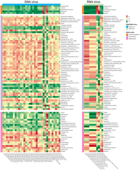 The heatmap shows color-coded Spearman’s correlations of differential DNA and RNA viruses (the horizontal bars) with clinical symptoms, gut bacteria, and metabolites (the longitudinal bars). Red indicates a positive correlation and green indicates a negative correlation. Colors of different multiomics data are shown in the legend.
