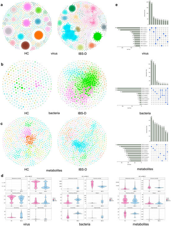 The single-omics co-occurrence network of gut virus, bacteria, and metabolites. (a) Gut virus co-occurrence networks in IBS-D and HC. Each hexagon node indicates a virus contig. The Spearman’s correlation analyses were used to construct the co-occurrence network (|r| > 0.8, p < 0.001). Node size is proportional to its degree. Edge thickness is proportional to Spearman’s rank correlation coefficient. Nodes and their edges are colored differently depending on the modularization result. (b) Gut bacteria co-occurrence networks in IBS-D and HC. Each circle node indicates a bacteria OTU. (c) Gut metabolites co-occurrence networks in IBS-D and HC. Each triangle node indicates a metabolite. (d) The violin plot shows the topological features of the co-occurrence networks in IBS-D and HC. (e) The UpSet plot illustrated low proportions of shared contigs in the top five modules of IBS-D and HC. The blue-filled dots connected by vertical lines indicate the intersection of the two modules. The vertical bars indicate the number of viral contigs within the intersections, and the horizontal bars indicate the total number of viral contigs in each module. IBS-D, diarrhea-predominant irritable bowel syndrome; HC, healthy control.