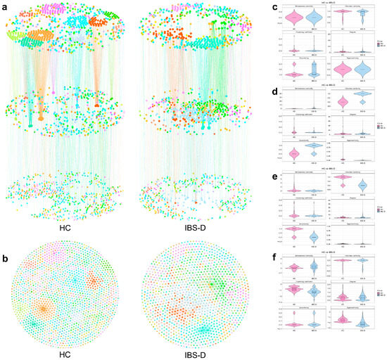 Interomics Spearman correlations were used to construct the cross-omics co-occurrence network. The multiomics network of patients with IBS-D contained 1248 nodes, 779 bacteria–metabolite edges, 497 virus–metabolite edges, and 901 virus–bacteria edges (Figure 6a,b). The virus–bacterial edges consisted of 758 positive and 142 negative edges. The integral topological feature analyses showed that, compared to the HC network, the IBS-D network had a higher average degree (26.76 vs. 21.9) and betweenness centrality, but a lower closeness centrality, eigenvector centrality, and average clustering coefficient. This suggests that the cross-omics correlations in patients with IBS-D might be more intricate and dispersed than those in HCs. In subgroup topological feature analysis, the closeness centrality of virus nodes in IBS-D was lower than that in HCs (Figure 6c, p < 0.05). Compared to those in the HC network (Figure 6c), the bacterial nodes in the IBS-D group had a higher degree of betweenness centrality and closeness centrality but a lower clustering coefficient (Figure 6d, p < 0.05). The top 25% of the modules accounted for 69.9% of the nodes in the IBS-D network. The largest module of the IBS-D network mainly consisted of Microviridae, Salasvirus, Mollicutes RF39, Ruminococcaceae UCG-014, Lachnospiraceae, Muribaculaceae, Prostaglandin F1a, N-methyl-L-glutamic Acid and gamma-glutamylleucine. The largest module of the HC network consisted mainly of Siphoviridae, Caudovirales, Microviridae, Ruminococcaceae UCG-014, Scardovia wiggsiae, and Bacteroides. Overall, these results confirm the presence of a distinct virus–bacteria–metabolite phenotype in IBS-D patients compared to that in HCs.