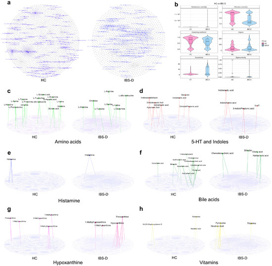 The short-chain fatty acid-producing bacteria and important metabolites in the multiomics co-occurrence network. (a) The SCFA-producing bacteria are highlighted with bright purple in the multiomics network. The rest of the elements in the network are gray. (b) The topological features of SCFA-producing bacteria in the multiomics networks. The network diagrams (c–h) show the important metabolites in the multiomics network. IBS-D, diarrhea-predominant irritable bowel syndrome; HC, healthy control.