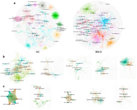 Patients with IBS-D may present with different gastrointestinal and psychological symptoms. We further analyzed the network correlations between the gut multiomics data and clinical symptoms of IBS-D. The three questionnaires completed by the participants were organized into a data matrix, including the GSS with seven subitems, the SDS score with 20 subitems, and the SAS score with 20 subitems. Then, Spearman correlation analyses were performed between the clinical symptom data and the gut virus, bacteria, and metabolite data. The 48 symptom factors of the symptom–multiomics network exhibited 896 correlations with the gut multiomics data of IBS-D patients, including 412 symptom–virus edges, 132 symptom–bacteria edges, and 352 symptom–metabolite edges (Figure 8a). The 48 symptom factors in the IBS-D network involved 14 modules, and the distribution of symptom factors in the modules showed a high concentration: the top three modules accounted for 66.67% of all symptom factors, and the largest module (No. 387) accounted for 43.75% of all symptom factors (Figure 8b and Supplementary Table S4). Module No. 387 involved two intestinal symptoms, twelve depressive symptoms, and seven anxious symptoms. The multiomics nodes of module No. 387 mainly included Microviridae, Incheonvrus, Caudovirales, Ruminococcaceae UCG-014, Mollicutes RF39, Lachnospiraceae, N-methyl-L-glutamic Acid, Hypoxanthine, and Glycylproline. The second largest module, No. 420, contained the most intestinal symptom factors, including abdominal pain, diarrhea, urgency, feeling of incomplete defecation, and total intestinal symptom score (Figure 8b). The multiomics nodes of module No. 420 mainly included Microviridae, Lightbulbvirus, Andromedavirus, Brussowvirus, Scardovia wiggsiae, Bacteroides, L-prolyl-L-proline, N-Ornithyl-L-taurine, and Tauroursodeoxycholic acid (Figure 8b). The HC network contained 7 GSS factors, 16 SDS factors, and 14 SAS factors, and was evenly distributed into 15 modules (Figure 8a and Supplementary Table S4). The top three modules accounted for 43.24% of all the symptom factors (Figure 8c). These results suggest that the symptom–multiomics network of IBS-D involves more psychological symptom factors. The symptom factors of IBS-D were highly clustered into several main modules in the network, which may participate in the pathogenesis of IBS-D.