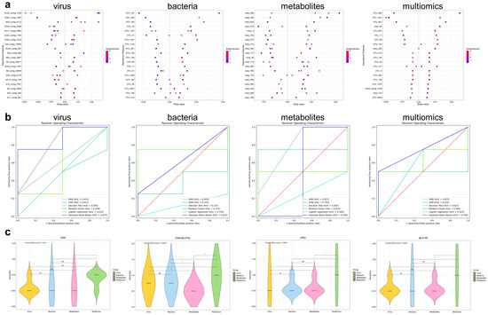 The prediction performances of different machine learning models for distinguishing IBS-D and HC. (a) The top 20 significant features selected by SHAP analyses in gut virus, bacteria, metabolite, and multiomics data. (b) ROC curves illustrate the potential of distinguishing IBS-D and HC by single-omics and multiomics data. (c) The prediction performances of different artificial neural networks in distinguishing IBS-D and HC. *, p < 0.05; **, p < 0.01; NS., Non-Statistical Significance. IBS-D, diarrhea-predominant irritable bowel syndrome; HC, healthy control.