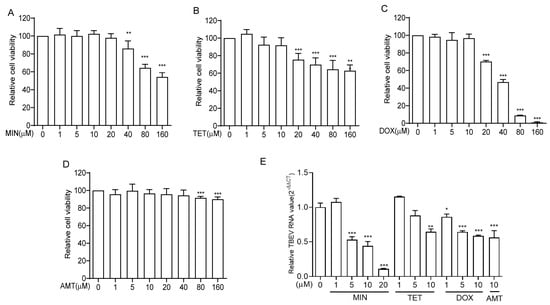 Evaluation of the influence of tetracycline antibiotics on the cell viability and inhibition of TBEV replication in Vero cells. (A–D) The effects of tetracycline antibiotics on cell viability in the Vero cells. The Vero cells were incubated with MIN, TET, DOX, and AMT for 72 h. (E) The effects of tetracycline antibiotics on the replication of TBEV was assessed using RT-qPCR. The dosages of the tetracycline antibiotics are shown below each graph. The difference between the two groups was analyzed using an independent sample t-test (***, ** and * indicate p < 0.001, p < 0.01 and p < 0.05, respectively).