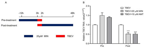 Evaluation of influence of MIN on the inhibition of TBEV replication under different modes of administration in Vero cells. (A) Diagram of different modes of administration, Blue reresents the duration of treatment and red represents the infection time of TBEV. (B) Comparative analysis of different modes of administration using RT-qPCR. The difference between the two groups was analyzed using an independent sample t-test (*** indicate p < 0.001).