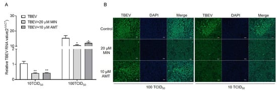 In order to determine the optimal MOIs of TBEV infection with MIN in the Vero cells, we infected the cells with TBEV at MOIs of 10TCID50 and 100TCID50 for 2 h, followed by incubation with MIN and AMT for 48 h. The cells were harvested, and the TBEV RNA and protein levels were detected using RT-qPCR and IFA, respectively. The RT-qPCR results show that both 20 μM MIN and 10 μM AMT effectively inhibited TBEV RNA expression levels at different MOIs of TBEV infection, showing a significant difference (Figure 3A). IFA with the TBEV antibody illustrates darker green signals in the 20 μM MIN groups at different MOIs of TBEV infection, showing a notably lower intensity of fluorescence than that in the TBEV group (Figure 3B). However, The intensity of green fluorescence in the 10 μM AMT group was only weakened at 10TCID50 TBEV infection.