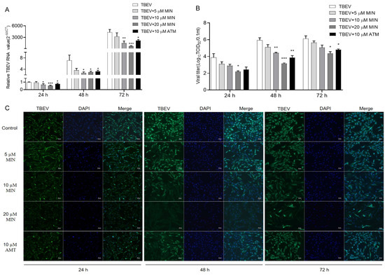 Evaluation of the influence of MIN on the inhibition of TBEV replication in the Vero cells. The optimal effective concentration and time of MIN inhibiting TBEV replication in the Vero cells were determined using RT-qPCR (A), viral titers (B), and IFA (C). The dosages of MIN are shown above each graph. The difference between the two groups was analyzed using an independent sample t-test (***, ** and * indicate p < 0.001, p < 0.01 and p < 0.05, respectively).