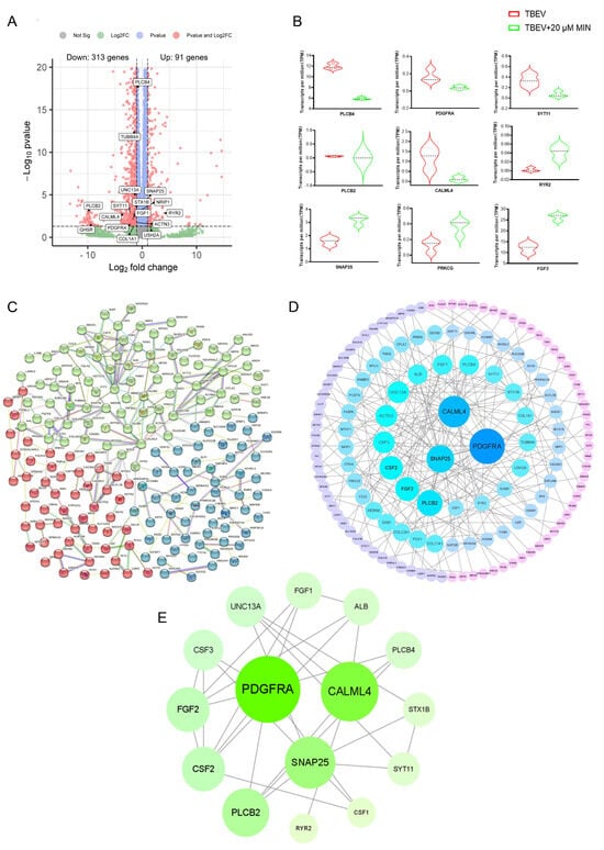 Gene expression profile under TBEV infection condition with MIN treatment. (A) Volcano plot of DEGs. (B) Transcriptomic sequencing results of PRKCG, PDGFRA, FGF2, CALML4, PLCB2, PLCB4, SYT11, SNAP25, and RYR2. (C) PPI network of DEGs. (D) Circle diagram of DEGs ranked by degree. (E) PPI network of 15 core genes.